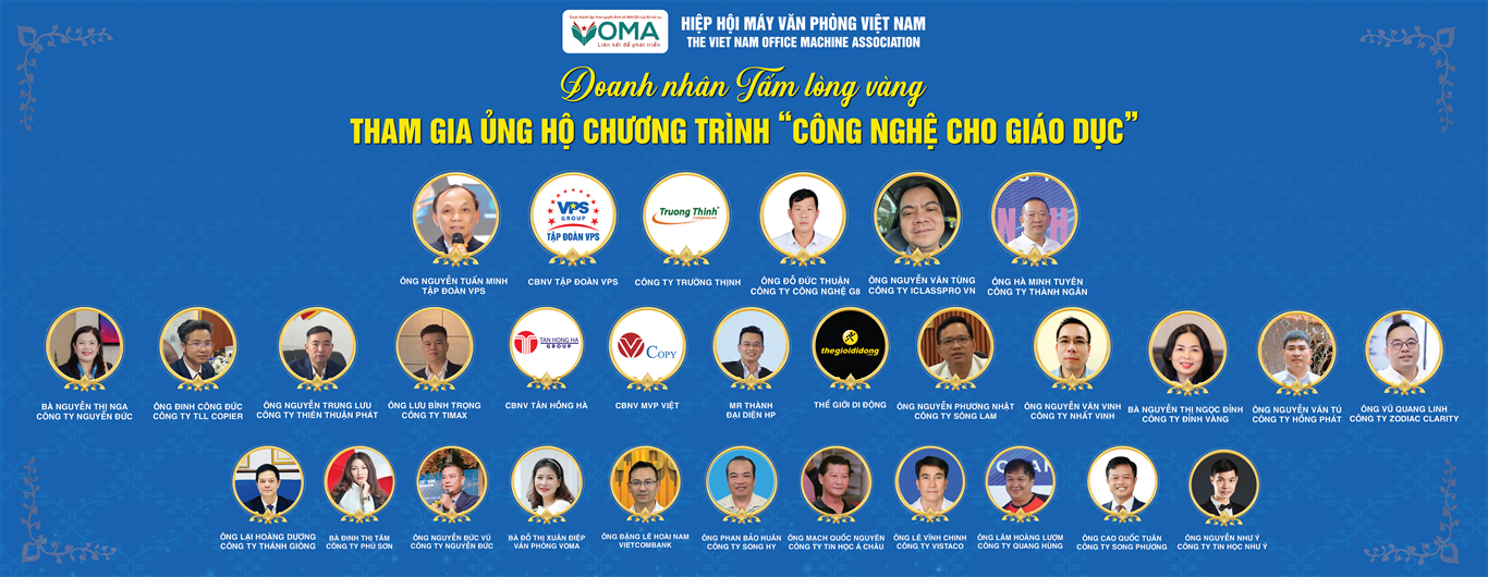 Hiệp hội Máy Văn phòng Việt Nam xin trân trọng cảm ơn các Doanh nhân Tấm lòng vàng đã đồng hành cùng chương trình. Sự đóng góp của quý vị không chỉ mang lại giá trị vật chất mà còn là nguồn động lực tinh thần to lớn, tiếp thêm niềm tin và hy vọng cho các em học sinh trên hành trình chinh phục tri thức.