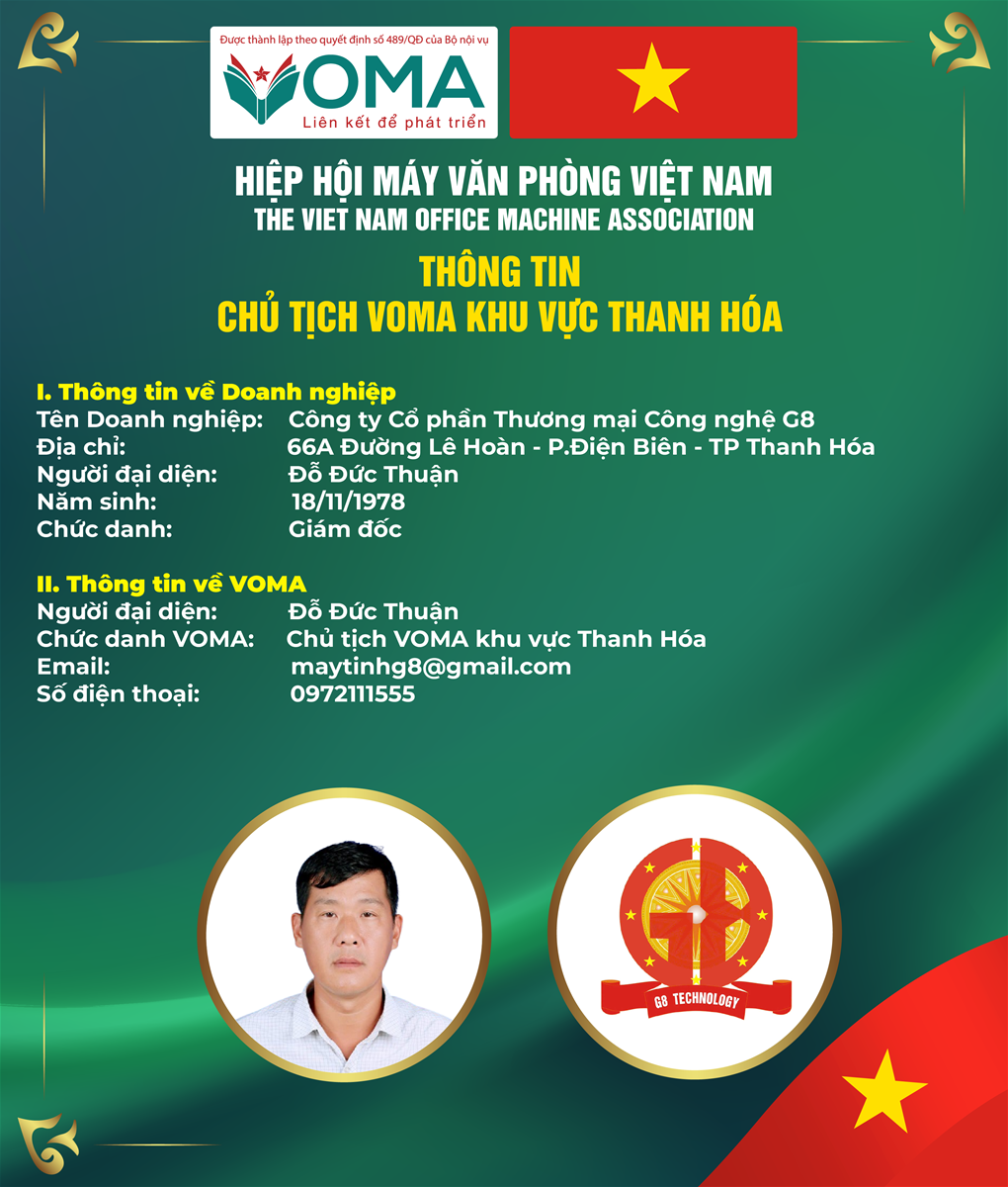 Ông Đỗ Đức Thuận hiện đang giữ vai trò Chủ tịch Hiệp hội VOMA khu vực Thanh Hóa và đồng thời là Giám đốc Công ty Cổ phần Thương mại Công nghệ G8. Với nhiều năm kinh nghiệm trong lĩnh vực công nghệ và thương mại, ông đã khẳng định được uy tín, năng lực lãnh đạo cũng như tầm nhìn chiến lược trong việc phát triển doanh nghiệp và đóng góp cho cộng đồng doanh nghiệp tại Thanh Hóa.