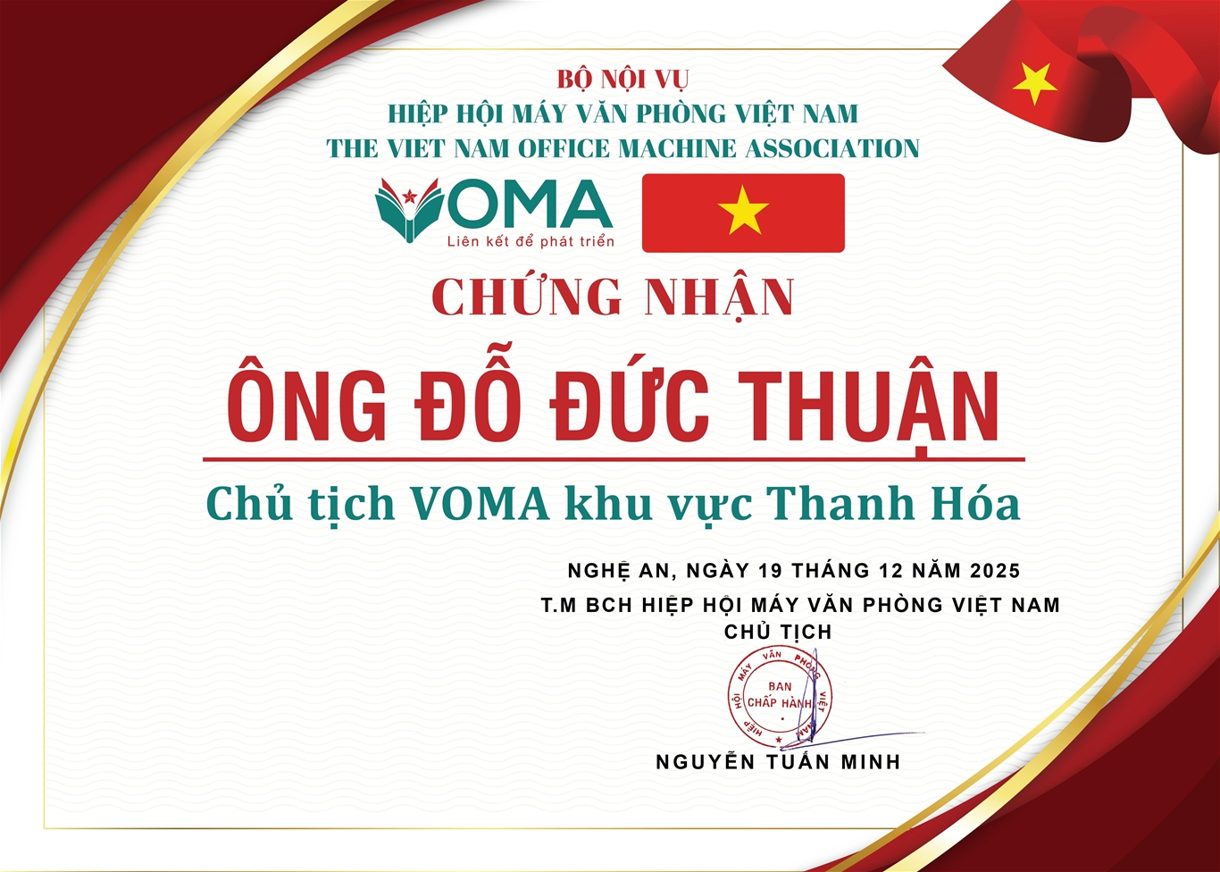Với vai trò Chủ tịch VOMA Thanh Hóa, ông Đỗ Đức Thuận sẽ tiếp tục sứ mệnh kết nối cộng đồng doanh nghiệp, thúc đẩy sự phát triển bền vững và lan tỏa tinh thần đổi mới sáng tạo trong lĩnh vực thiết bị văn phòng – công nghệ.