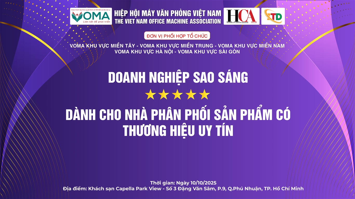 Hiệp hội Máy Văn phòng Việt Nam (VOMA) trân trọng công bố Chương trình Doanh nghiệp Sao Sáng 2025 – giải thưởng danh giá bậc nhất của ngành máy văn phòng, được tổ chức nhằm tôn vinh những doanh nghiệp tiên phong, sáng tạo, có đóng góp xuất sắc trong việc nâng tầm thương hiệu và củng cố niềm tin trong lòng người tiêu dùng Việt Nam.