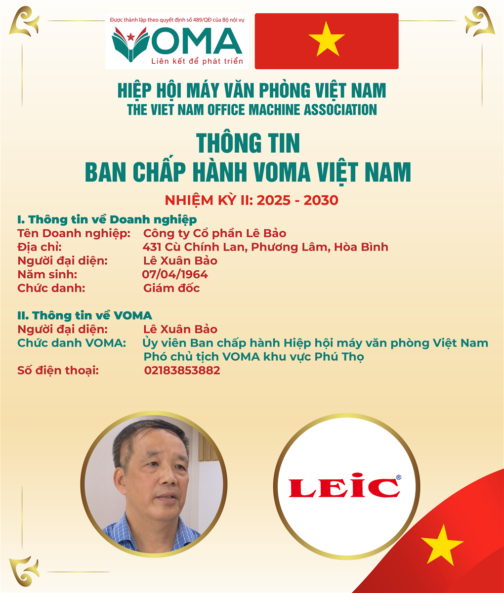 Ông Lê Xuân Bảo là một trong những gương mặt tiêu biểu của ngành máy văn phòng Việt Nam. Với nhiều năm kinh nghiệm, ông đã khẳng định được uy tín và năng lực lãnh đạo, trở thành cầu nối quan trọng giữa cộng đồng doanh nghiệp địa phương và Hiệp hội trên phạm vi toàn quốc.