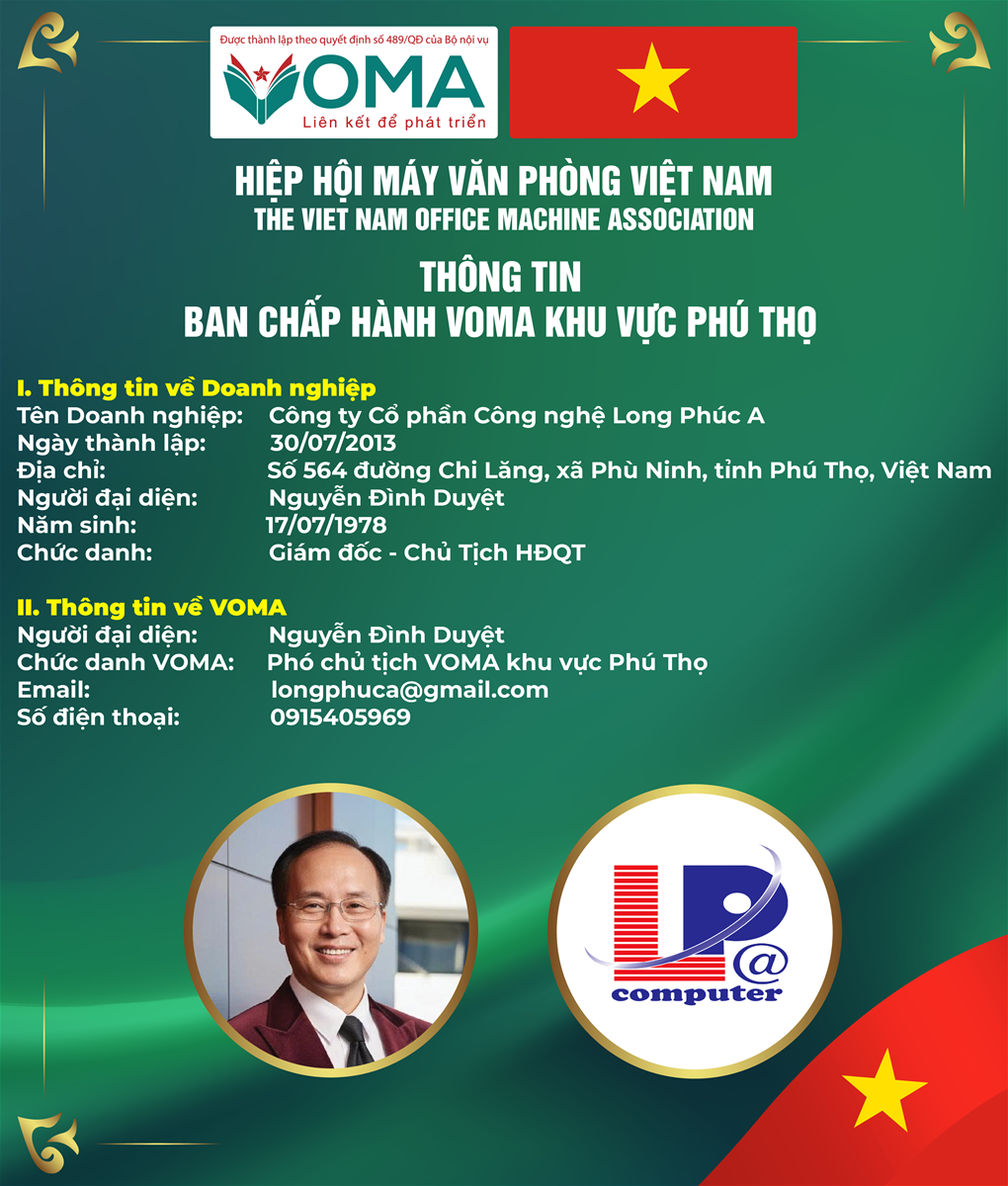 👉 Với sự dẫn dắt của Ông Nguyễn Đình Duyệt, Long Phúc A đang từng bước khẳng định vị thế thương hiệu công nghệ tiên phong tại Việt Nam, đồng thời đóng góp tích cực cho sự phát triển của cộng đồng doanh nghiệp VOMA.