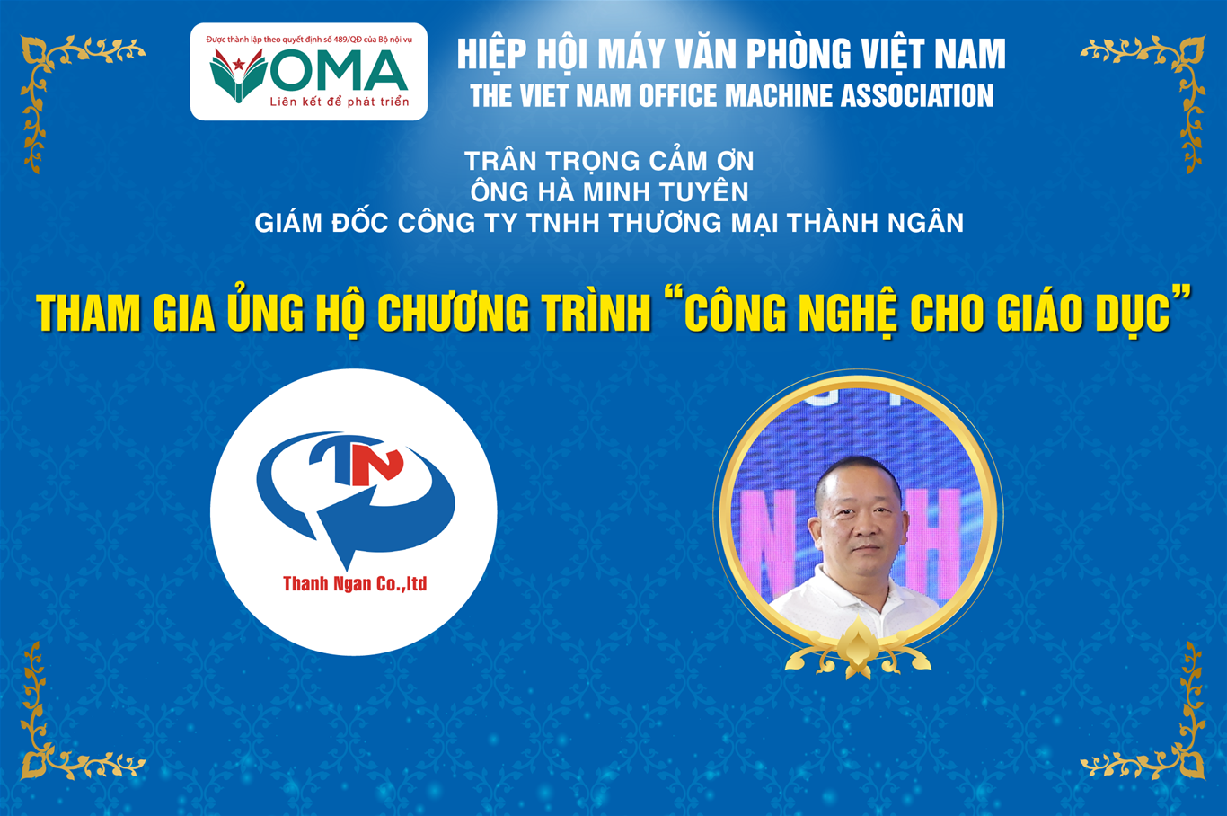 Hiệp hội Máy văn phòng Việt Nam (VOMA) trân trọng cảm ơn ông Hà Minh Tuyên, Giám đốc Công ty TNHH Thương mại Thành Ngân, vì đã tham gia và đồng hành cùng chương trình “Công nghệ cho giáo dục” – hoạt động kết nối giữa doanh nghiệp và cộng đồng giáo dục nhằm thúc đẩy ứng dụng công nghệ vào môi trường học tập hiện đại.
