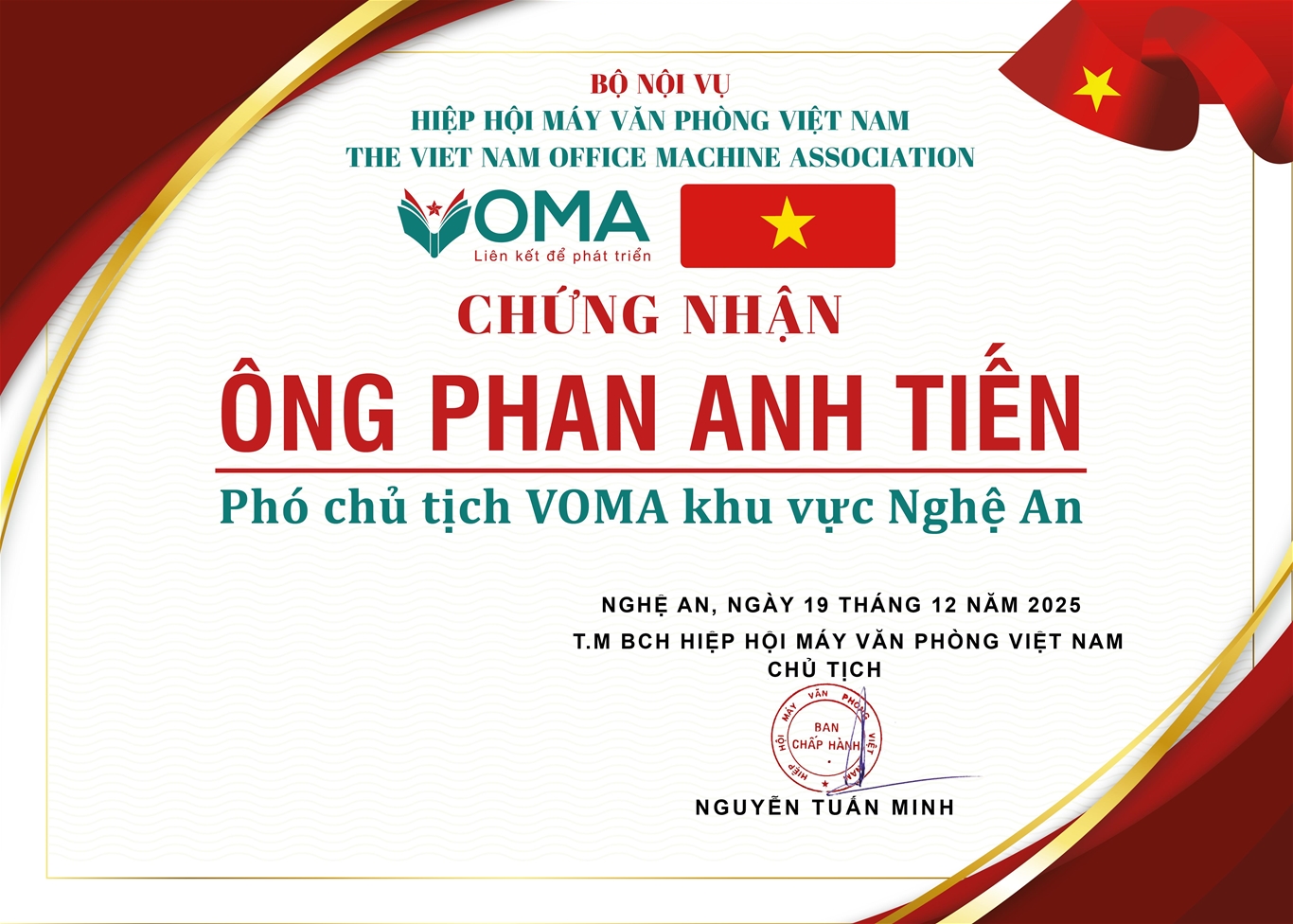 ✨ VOMA tin tưởng rằng với tâm huyết và kinh nghiệm, ông Phan Anh Tiến sẽ cùng cộng đồng doanh nghiệp Nghệ An kiến tạo những bước tiến mới, đóng góp tích cực cho sự phát triển chung của ngành máy văn phòng Việt Nam.